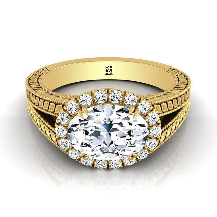 แหวนหมั้นเพชรทรงวงรีสไตล์วินเทจทองคำเหลือง 18K ดีไซน์แยกช้างข้าวโพดและฮาโล