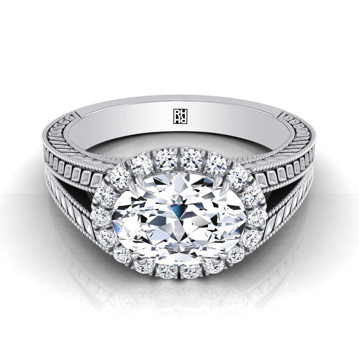 แหวนหมั้นเพชรฮาโลว์แบบแยกช้างก้านข้าวสาลีรูปวงรีวินเทจสีแพลตตินัม