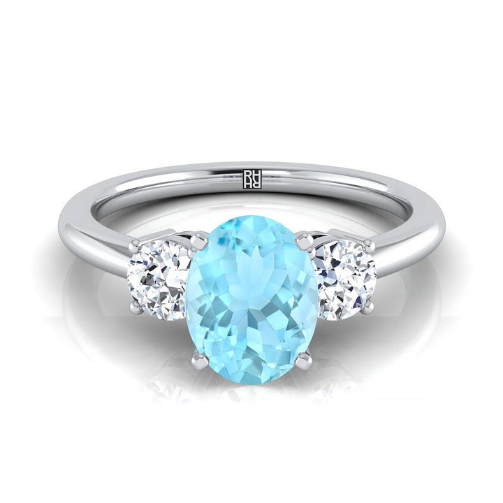 แหวนหมั้นเพชรสามเม็ดทรงกลมที่เข้าคู่กันอย่างสมบูรณ์แบบ ประกอบด้วยอควอมารีนรูปไข่ทองคำขาว 14K - 1/4ctw