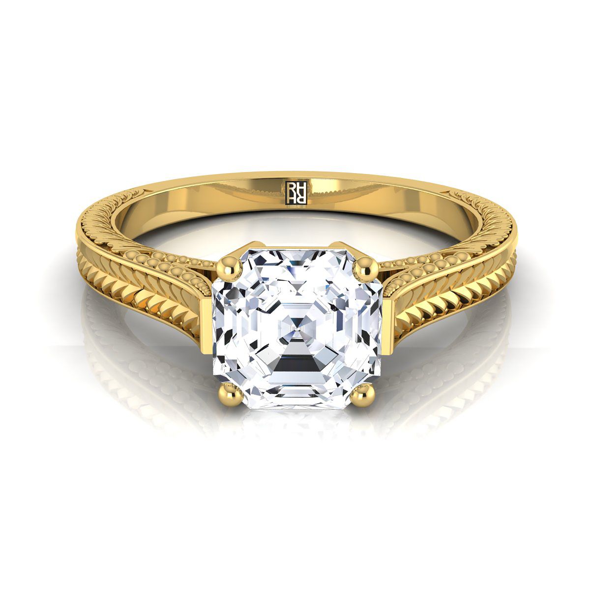 แหวนหมั้นเดี่ยวสไตล์วิกตอเรียแกะสลักด้วยมือ ประดับเพชรทรงแอสเชอร์ ทองคำ 14K สีเหลือง