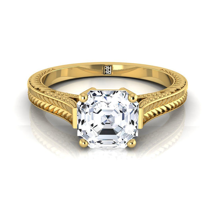 ความสง่างามที่เรียบง่าย แหวนหมั้นเพชรทรงแอสเชอร์นี้นำเสนอการออกแบบสลักลายที่ได้รับแรงบันดาลใจจากโบราณ พร้อมด้วยการตกแต่งมิลเกรนคลาสสิกในทองคำเหลือง 14 กะรัต