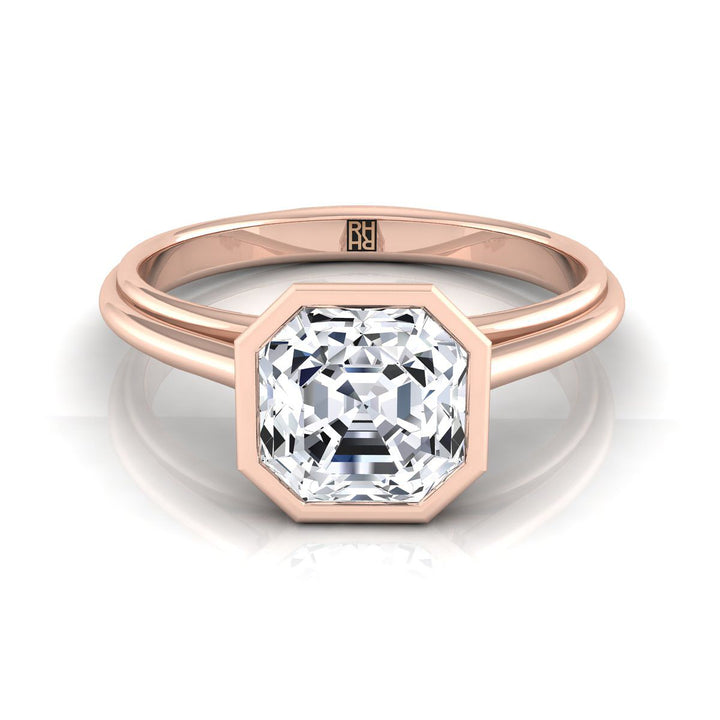 ความสง่างามที่เรียบง่าย แหวนหมั้นเพชรทรงแอสเชอร์นี้มีเพชรเดี่ยวที่ตั้งอยู่ในกรอบแบบเบเซลในกรอบทองกุหลาบ 14k คลาสสิก
