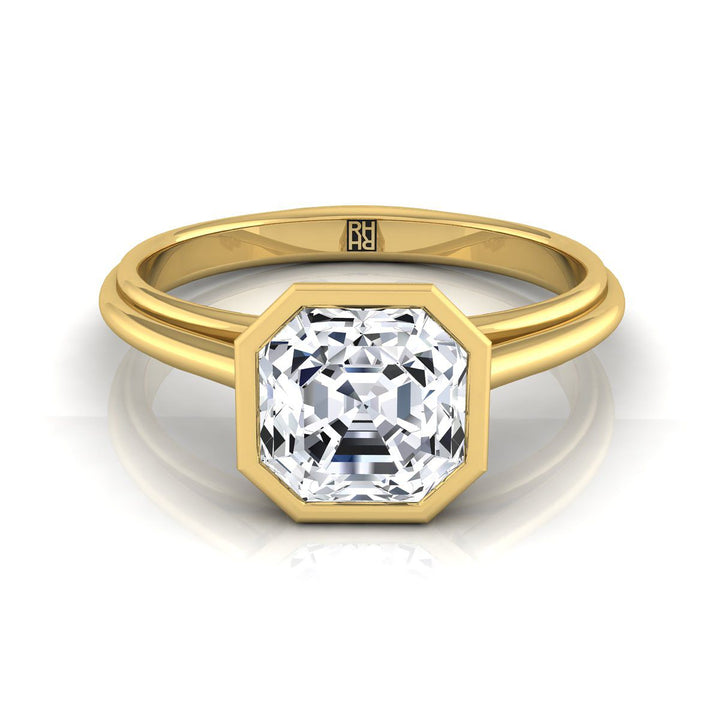 ความสง่างามที่เรียบง่าย แหวนหมั้นเพชรเจียระไนแอสเชอร์นี้นำเสนอเพชรโซลิแทร์ที่ตั้งแบบขอบล้อมในตัวเรือนทองคำเหลือง 14 กะรัตคลาสสิก