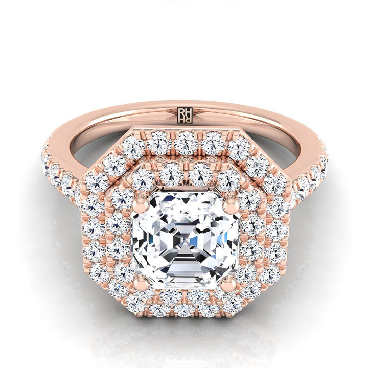 แหวนหมั้นเพชรแบบ Double Pave Halo ตัด Asscher 14K สีโรสโกลด์ - 7/8ctw