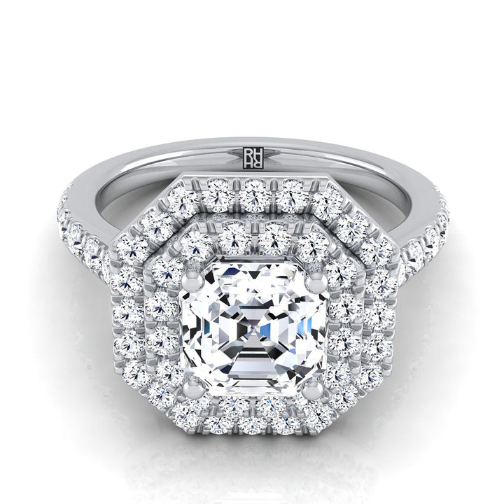 แหวนหมั้นเพชร 18K ทองขาว เจียระไนแอสเชอร์ แบบดับเบิลเพฟ ฮาโล่ พร้อมเพชรเส้นตรง - 7/8ctw