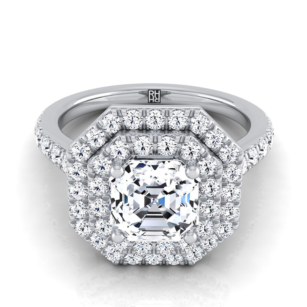 แหวนหมั้นแบบแฮนด์คราฟต์อย่างประณีต ดีไซน์แหวนแบบ Double Pave Asscher Cut Halo โชว์เพชรเจียระไนแบบ Brilliant Cut (h-i/vs 0.75 Ctw) ที่ประดับอย่างสวยงามในตัวเรือนแพลตตินัมคลาสสิก.