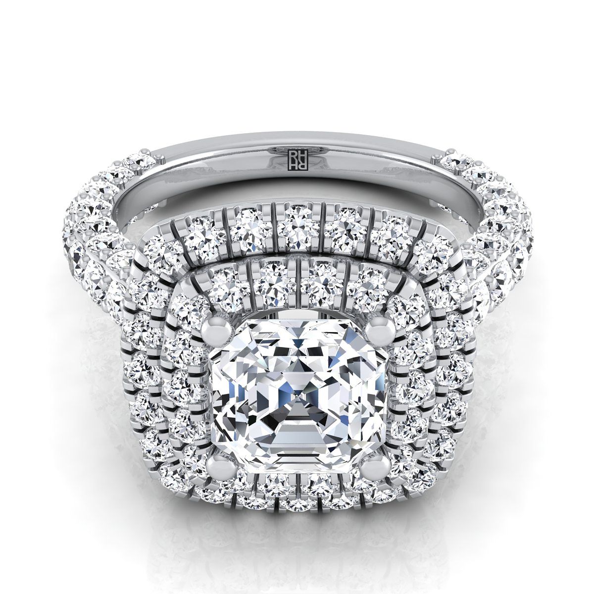 แหวนหมั้นทองคำขาว 18K ประดับเพชรทรงแอสเชอร์ ตกแต่งแบบหนาและหรูหราด้วยฮาโลคู่สไตล์ฝรั่งเศสแบบปาเว่ - 2ctw
