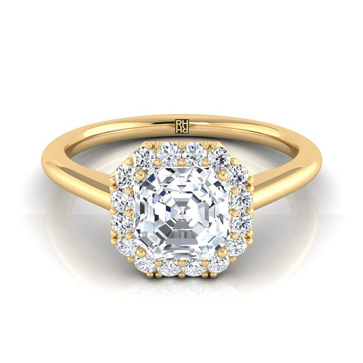 แหวนหมั้นแบบแอสเชอร์คัทฮาโลพาเว่ที่แสดงถึงสไตล์คลาสสิกนี้ โชว์เพชรเจียระไนแบบบริลเลียนต์คัท (h-i/vs 0.20 Ctw) ที่ประดับอย่างสวยงามในตัวเรือนทองคำเหลือง 18 กะรัตแบบคลาสสิก