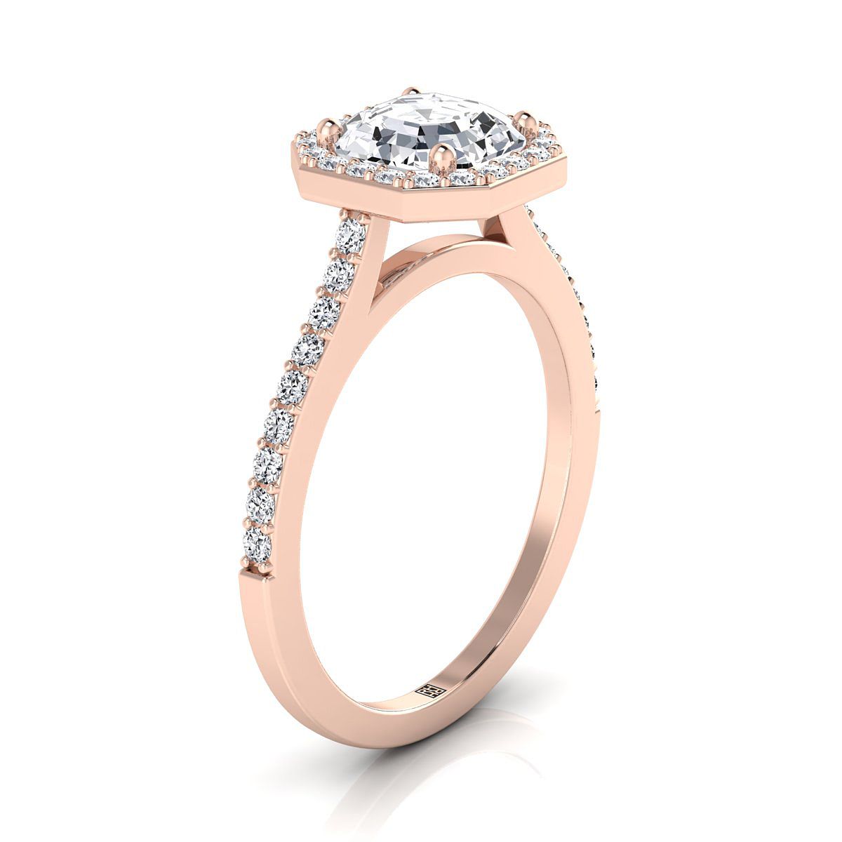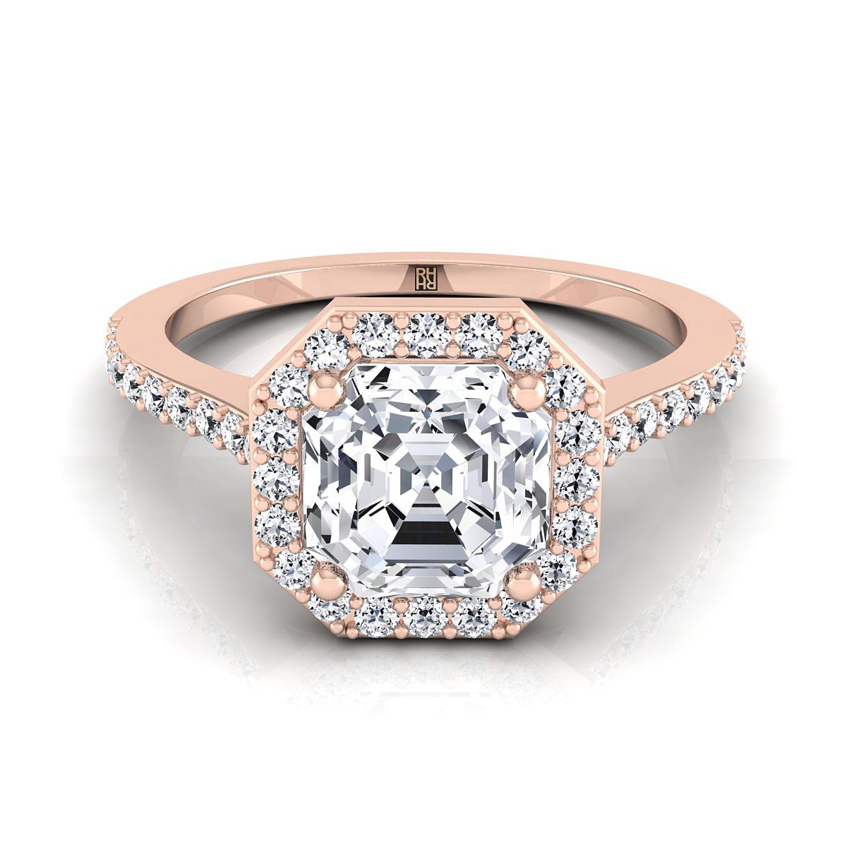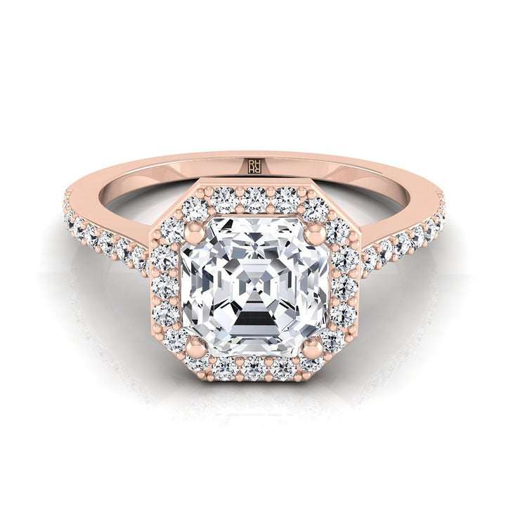 แถลงการณ์ที่สง่างามของสไตล์ แหวนหมั้นแบบ Halo Pave ที่ตัด Asscher นี้นำเสนอเพชรที่ตัดอย่างสวยงาม (h-i/vs 0.33ctw) ที่ตั้งอยู่ในกรอบทองกุหลาบ 14k แบบคลาสสิกอย่างสวยงาม