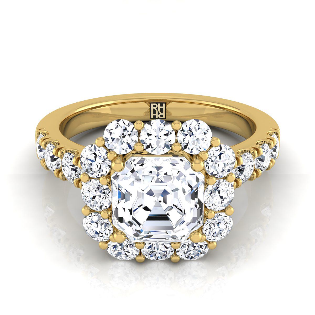 แหวนหมั้นสไตล์หรูหราประดับเพชรทรงแอสเชอร์ ตัดด้วยทองคำเหลือง 14K พร้อมฮาโลฝรั่งเศสแบบปาเว่ น้ำหนักรวม 1-1/10 กะรัต