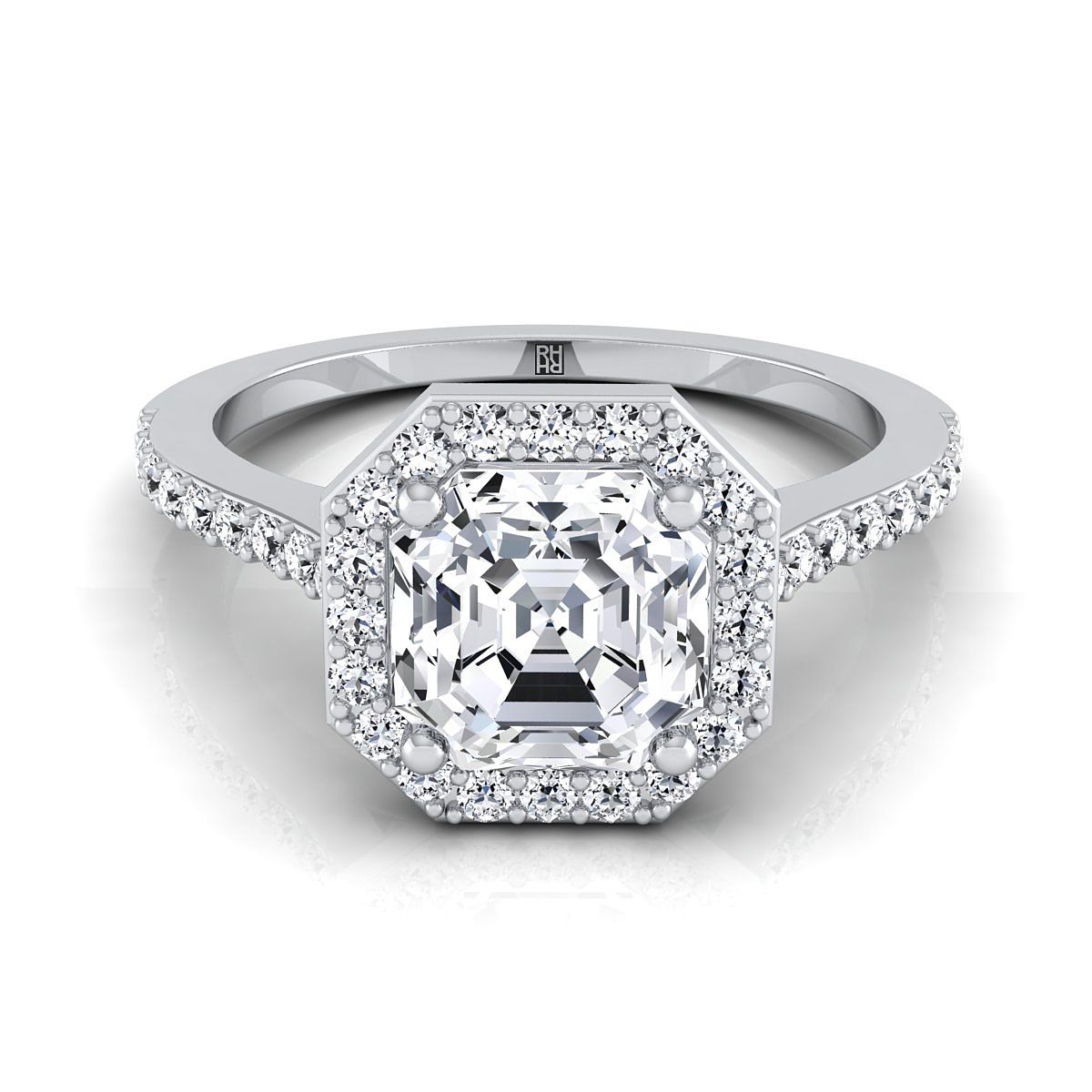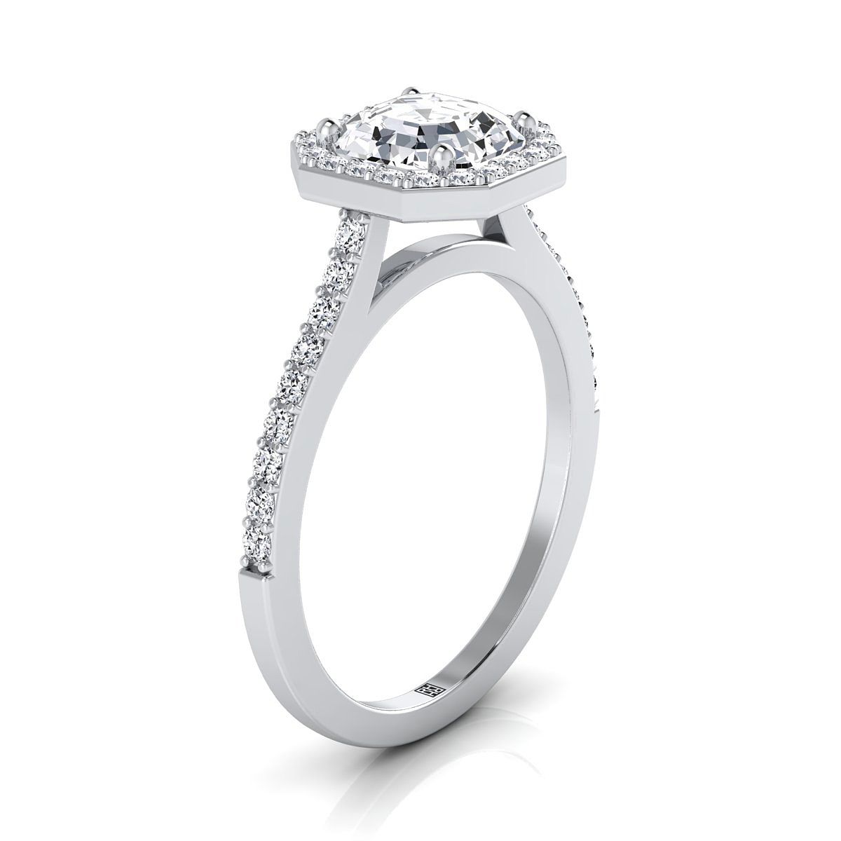 แสดงออกถึงสไตล์ที่สง่างาม แหวนหมั้นแบบแอสเชอร์คัท ฮาโลว์ พาเว่ นี้นำเสนอเพชรเจียระไนแบบบริลเลียนต์คัท (h-i/vs 0.33ctw) ที่ประดับอย่างสวยงามในตัวเรือนแพลตตินัมคลาสสิก