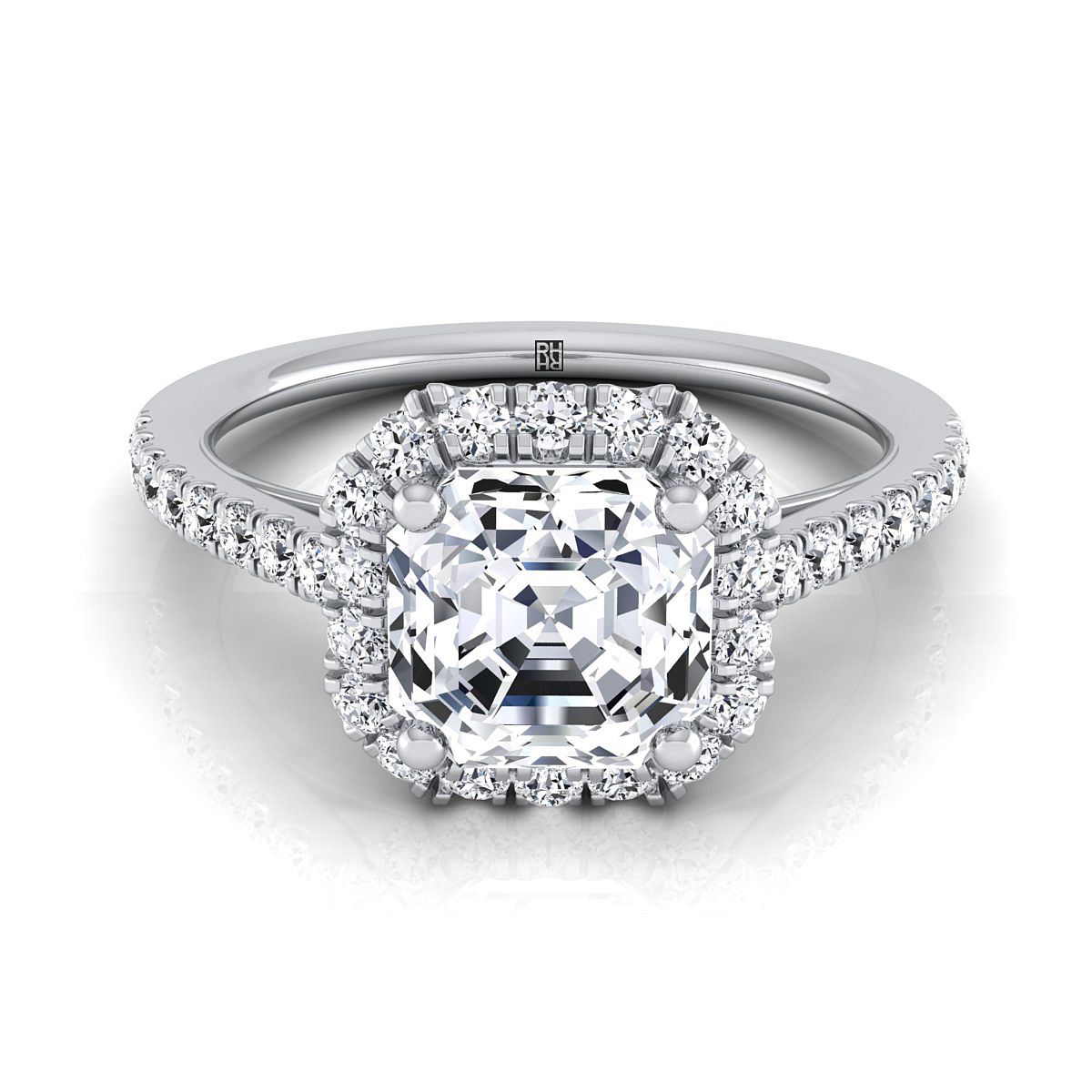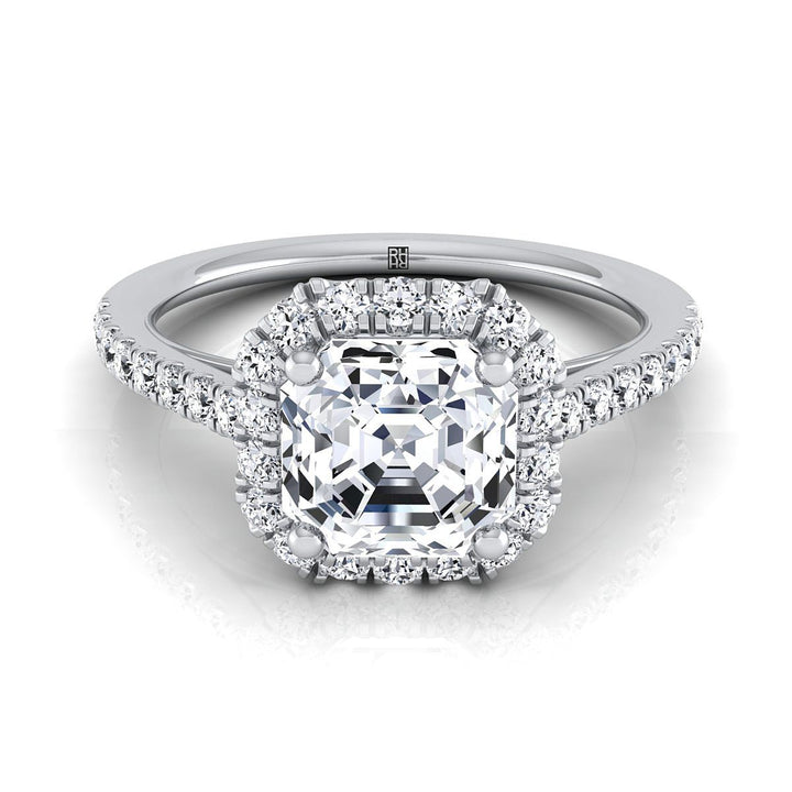 แหวนหมั้นแบบ Asscher Cut Halo Pave ที่ทำด้วยมืออย่างประณีตนี้ โชว์เพชรเจียระไนแบบ Brilliant Cut (h-i/vs 0.40ctw) ที่ตั้งไว้อย่างสวยงามในตัวเรือนทองคำขาว 14k คลาสสิก.