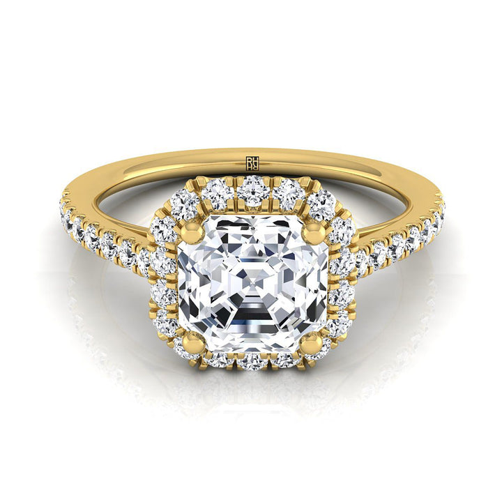 แหวนหมั้นทองคำเหลือง 14K แบบแอสเชอร์คัท เพชรขนาดเล็กแบบฮาโล พร้อมฝรั่งเศสปาเว่ - 3/8ctw