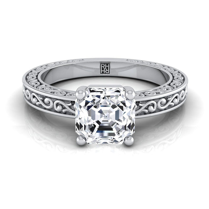 แหวนหมั้นโซลิแทร์วินเทจทองคำขาว 18K เจียระไนแอสเชอร์ สลักลายด้วยมือ