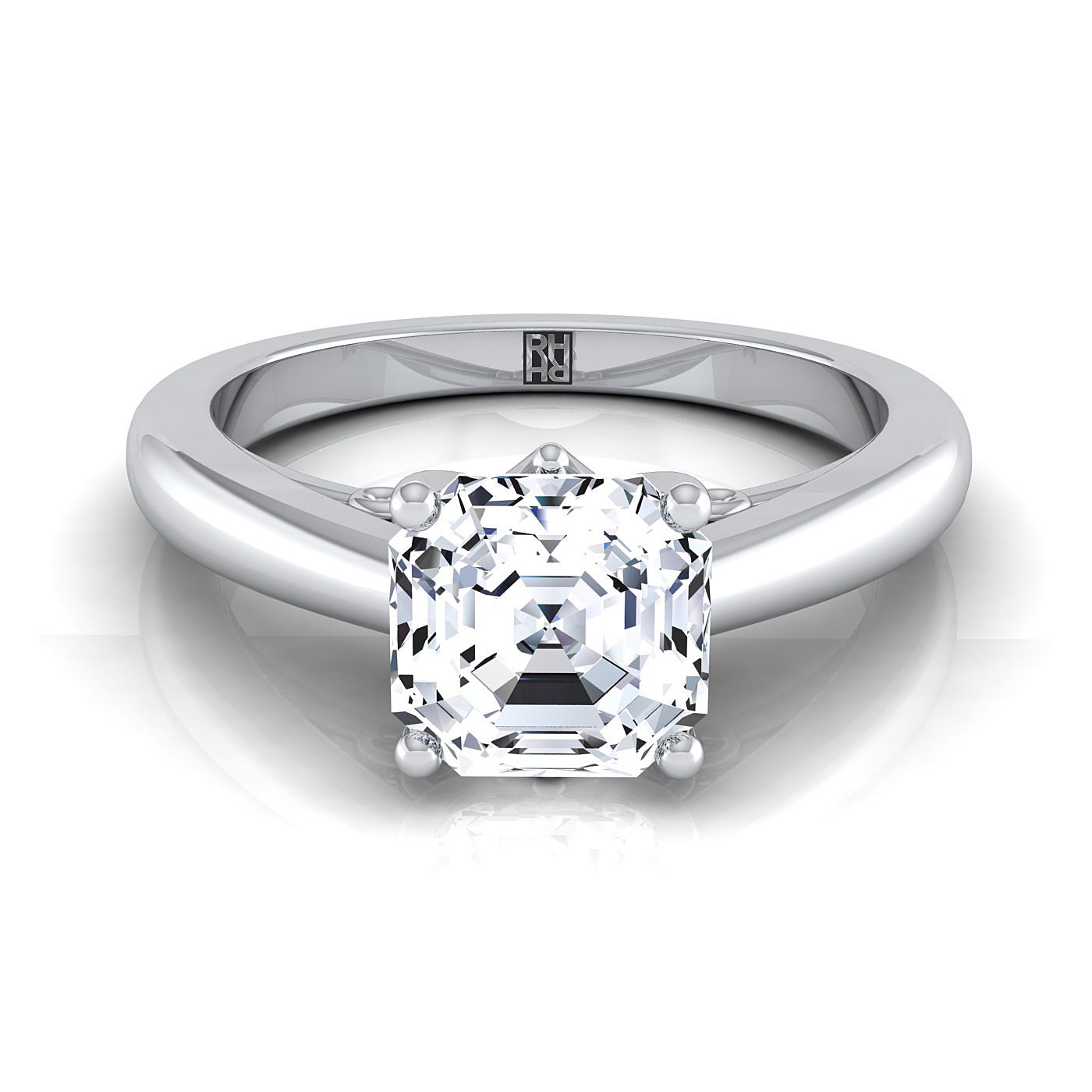 ความสง่างามที่เรียบง่าย แหวนหมั้นเพชรทรงแอสเชอร์นี้แสดงให้เห็นถึงแกลเลอรีดีไซน์สลักลายม้วนด้วยการขัดเงาสูงแบบคลาสสิกในทองคำขาว 14 กะรัต