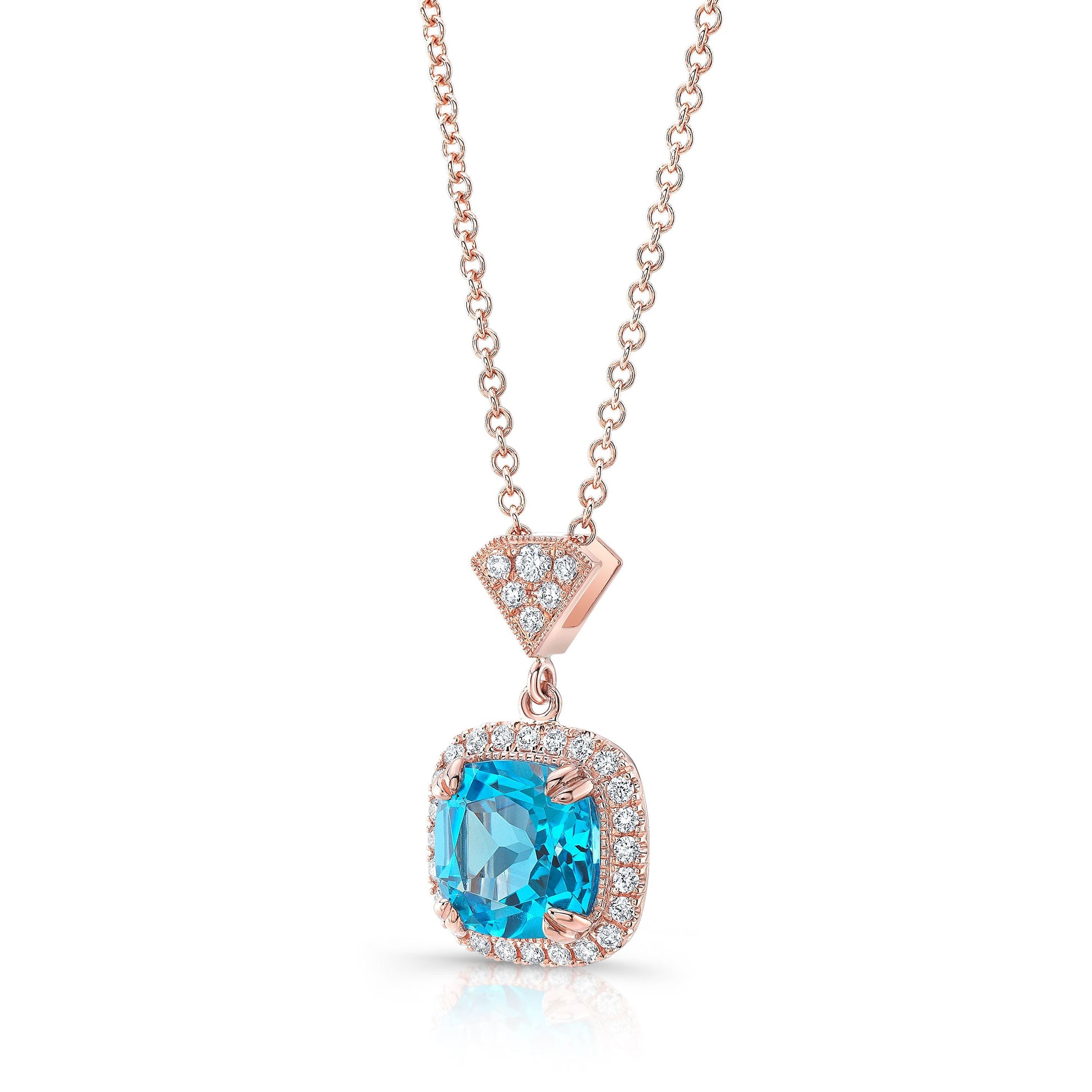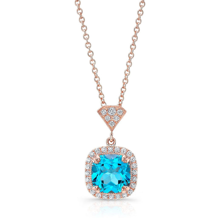 จี้ทรงหมอนบลูโทแพซและฮาโลเพชรในทองกุหลาบ 14k