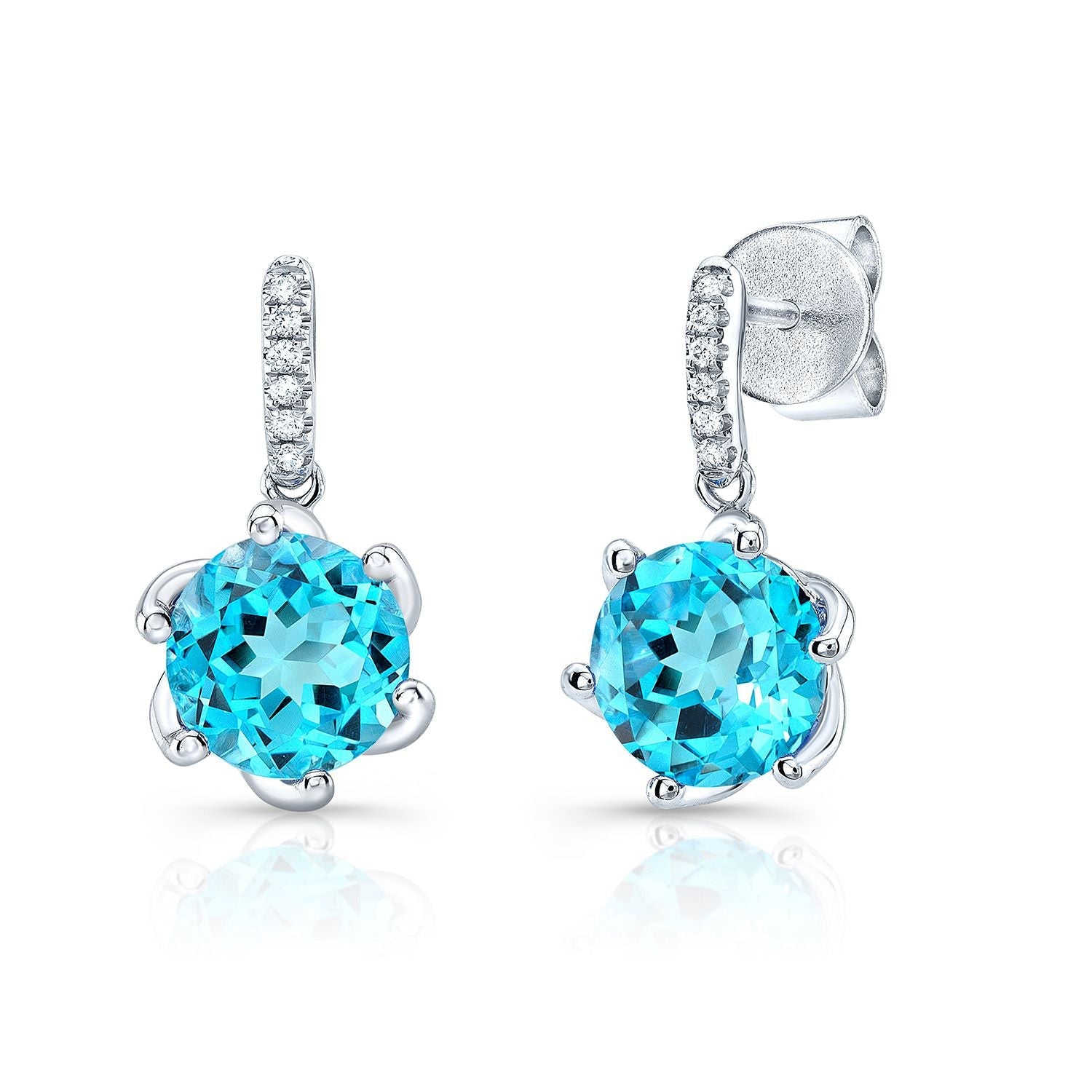 ต่างหูหยดทรงกลมบลูโทแพซพร้อมตะขอโค้งและตะกร้ารองเพชรประดับบนทองคำขาว 14 กะรัต (7.5 มม.)