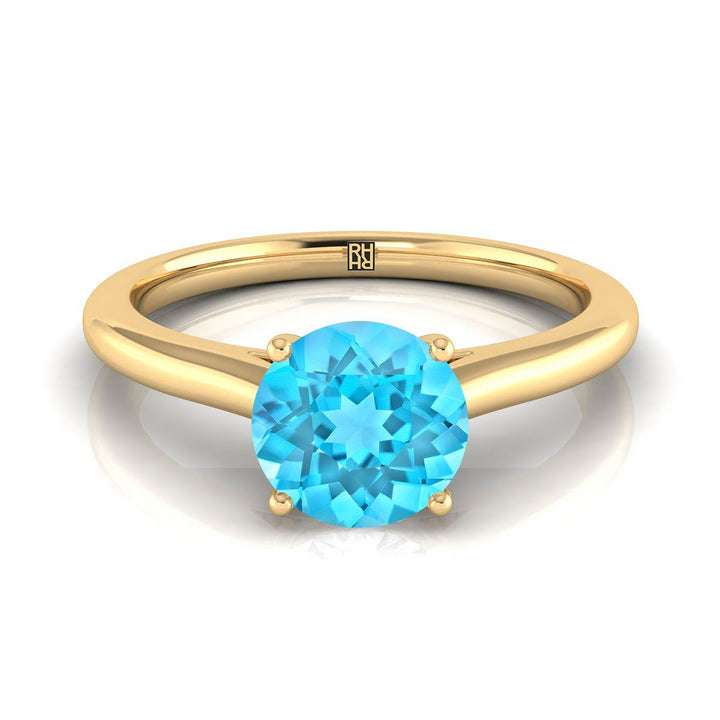 แหวนหมั้นเดี่ยวแบบหนีบขอบสวมใส่สบายหัวแหลมก้านหนามทองคำเหลือง 14K ประดับทับทิมสวิสสีน้ำเงินทรงกลมเจียระไนแบบบริลเลียนท์