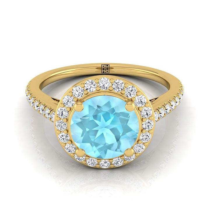 แหวนหมั้นเพชรแกลเลอรีลับแบบฝรั่งเศสประดับอะความารีนทรงกลมเจียระไนแบบบริลเลียนต์สีเหลืองทอง 18K - 3/8ctw