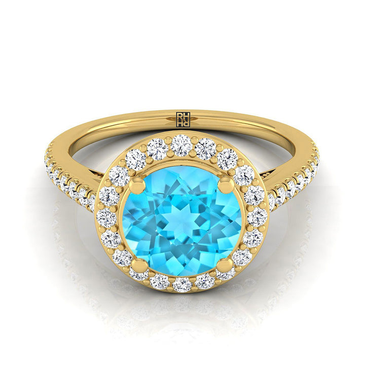 แหวนหมั้นเพชรแกลเลอรีลับแบบฝรั่งเศสประดับทับทิมสวิสสีน้ำเงินทรงกลมเจียระไนแบบบริลเลียนต์ทองคำเหลือง 14K - 3/8ctw