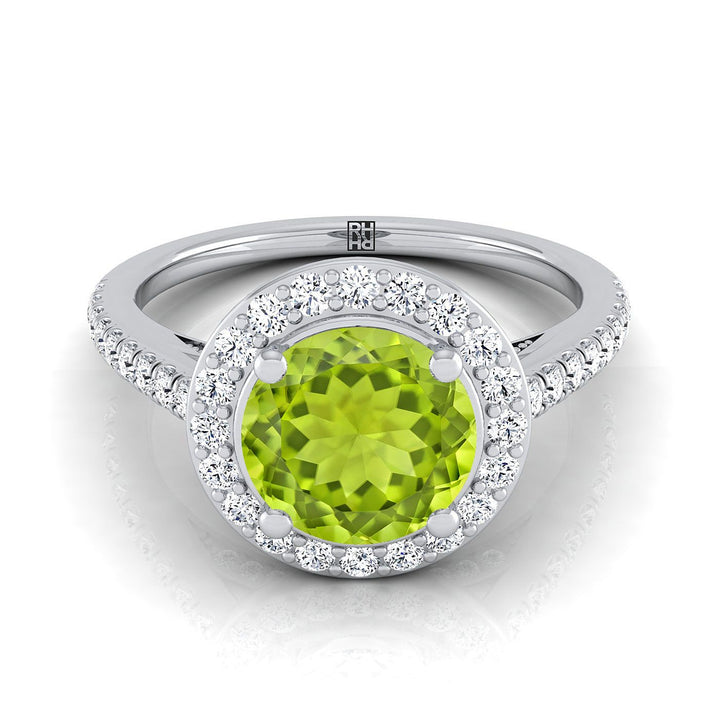แหวนหมั้นแพลทินัมพร้อมเพชรประดับรอบ 6 มม. หินเพอริดอตทรงกลมตรงกลางและเพชรทรงกลมเจิดจรัส 66 เม็ด น้ำหนักรวม 0.41 กะรัต