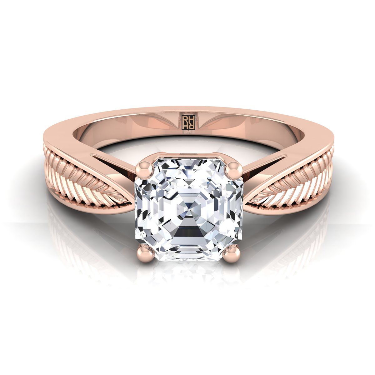 โดดเด่นและสง่างาม แหวนหมั้นเพชรแบบโซลิแทร์ที่มีการตัดแบบแอสเชอร์ในทองคำกุหลาบ 14k แสดงให้เห็นถึงตัวเรือนที่มีลวดลายใบไม้ที่ประณีต รวมถึงการตั้งแบบ 4 ขา สำหรับเพชรกลางน้ำหนัก 1.25ctw