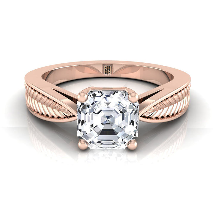 แหวนหมั้นแบบโซลิแทร์ที่มีลวดลายใบไม้แรงบันดาลใจจากยุคเก่า ตัดแบบแอสเชอร์ สีทองกุหลาบ 14K