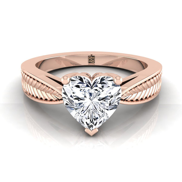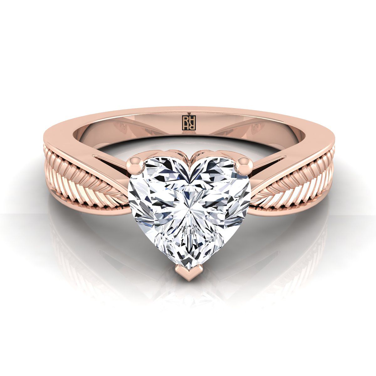แหวนหมั้นแบบโซลิแทร์รูปหัวใจทองคำชมพู 14K ที่มีลวดลายใบไม้แบบวินเทจ