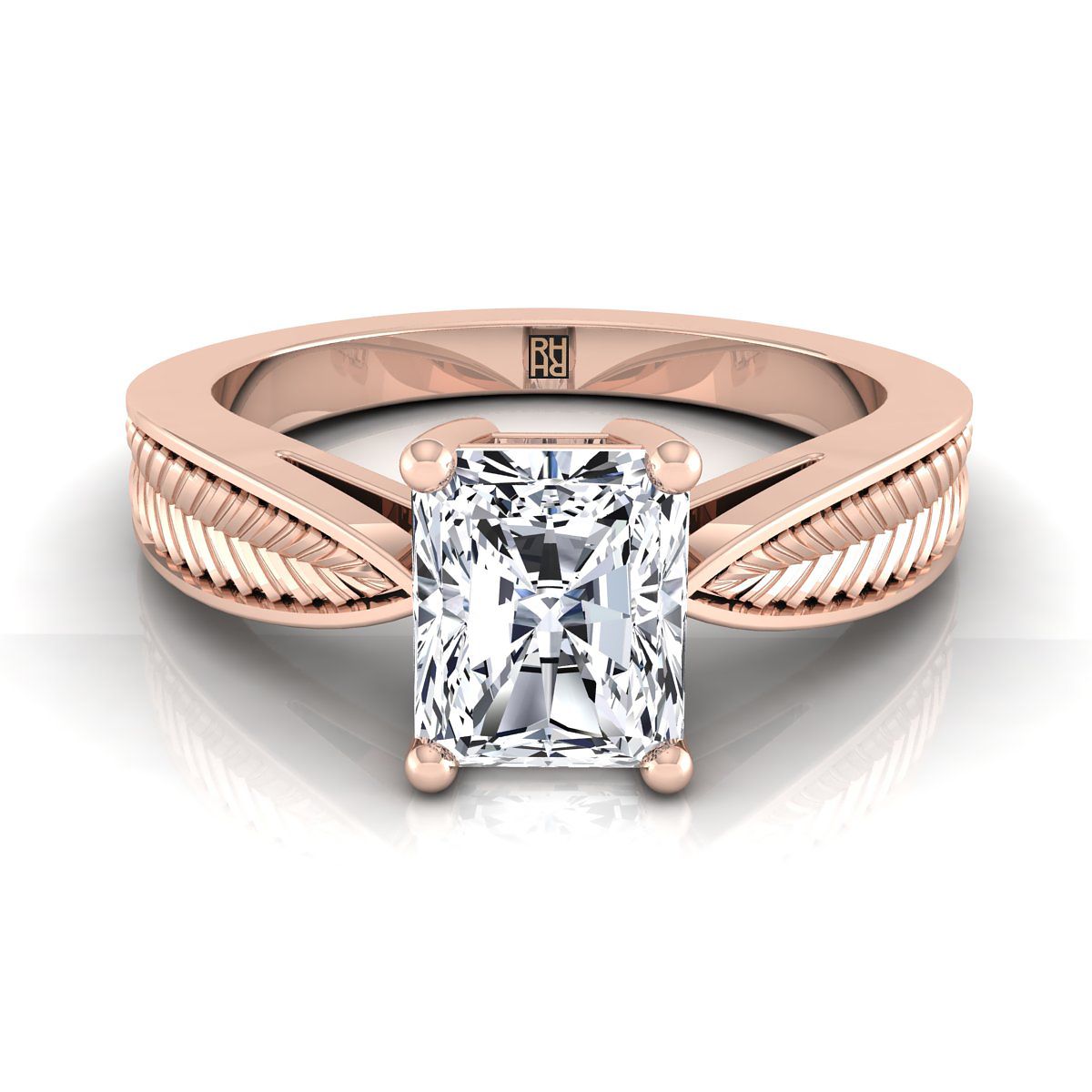หนักแน่นและสง่างาม แหวนหมั้นเพชรเจียระไนแบบ Radiant Cut นี้ในทองกุหลาบ 14k โชว์ความงดงามของก้านแหวนที่มีลวดลายใบไม้ละเอียดอ่อน รวมถึงการตั้งเม็ดเพชรแบบ 4 ก้านสำหรับเพชรกลางน้ำหนัก 1.25 กะรัต