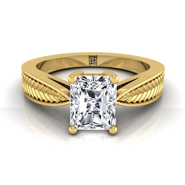 หนักแน่นและสง่างาม แหวนหมั้นเพชรเจียระไนแบบ Radiant Cut นี้ในทองคำเหลือง 18k โชว์ความงดงามของก้านแหวนที่มีลวดลายใบไม้ที่ประณีต รวมถึงการตั้งเม็ดเพชรแบบ 4 กรงสำหรับเม็ดกลางขนาด 1.25 กะรัต