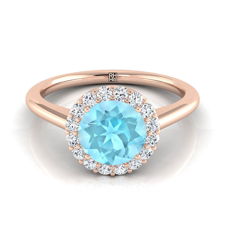 แหวนหมั้นทองคำชมพู 14K ประดับอความารีนทรงกลมเจียระไนแบบ Brilliant พร้อมเพชรล้อมแบบ Shared Prong Halo - 1/5ctw