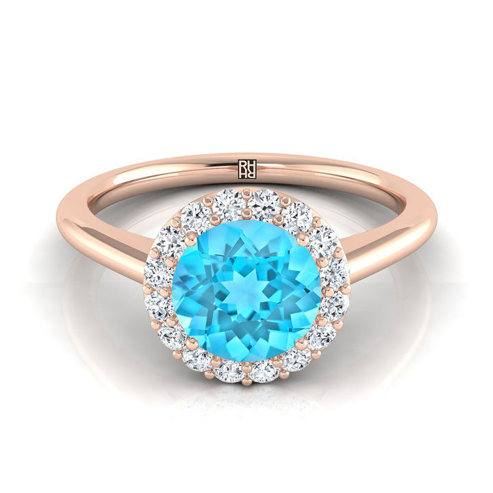 แหวนหมั้นทองคำ 14K ชุบทองกุหลาบ ประดับทับทิมสวิสสีน้ำเงินทรงกลมเจียระไนแบบ Brilliant พร้อมเพชรล้อมแบบ Shared Prong Halo - 1/5 กะรัตรวม