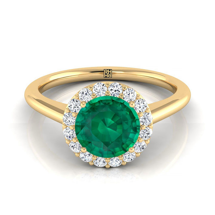 แหวนหมั้นทองคำเหลือง 18k พร้อมเพชรทรงกลมขนาด 6 มม. ตรงกลางเป็นมรกต และเพชรทรงกลมเจียระไนแบบ Brilliant จำนวน 16 เม็ด น้ำหนักรวม 0.22 กะรัต