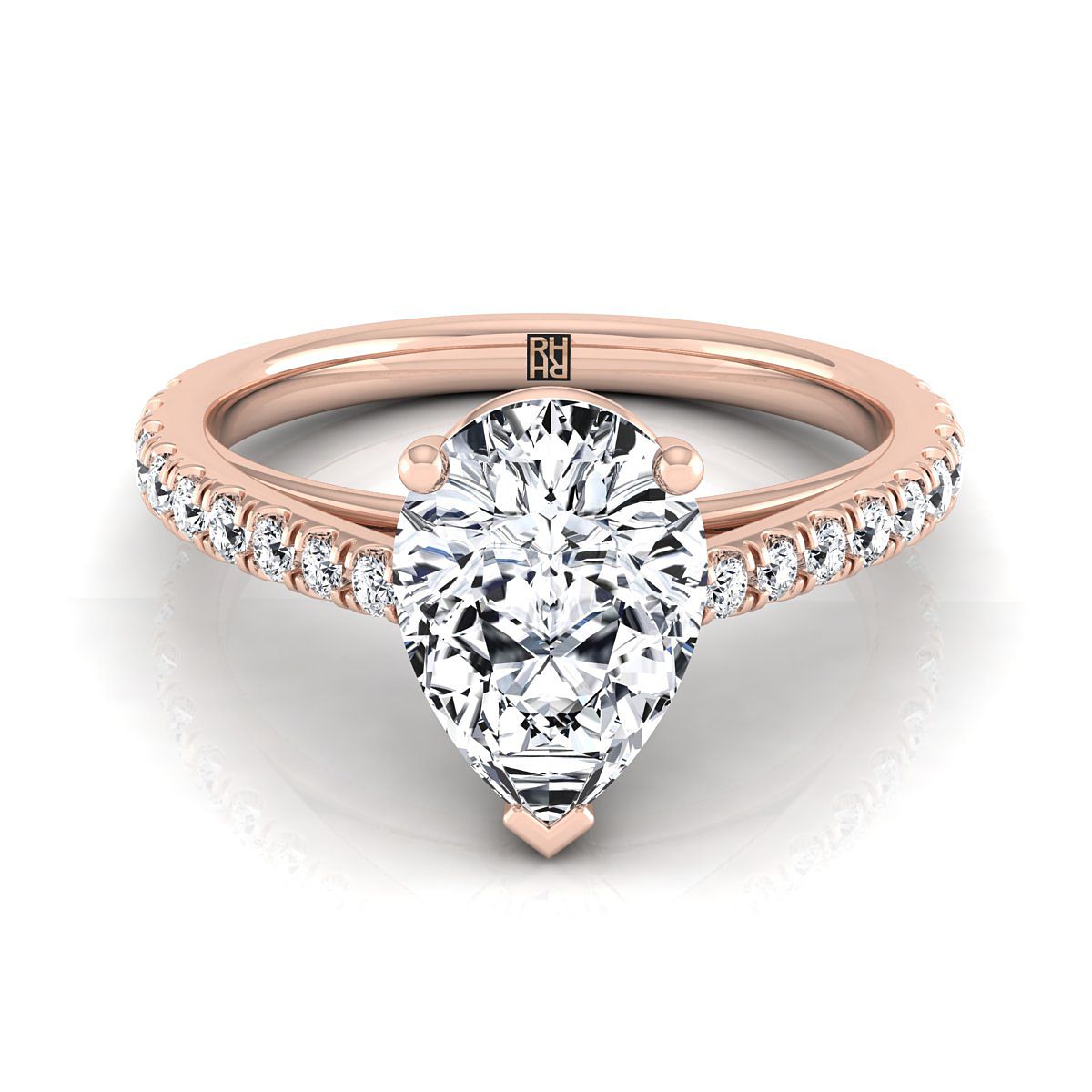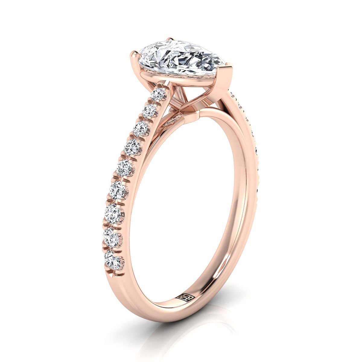 แหวนหมั้นเดี่ยวสไตล์วิหารฝรั่งเศสประดับเพชรทรงลูกแพร์ตรงกลางทองกุหลาบ 14K ประดับเพชรปาเว่รวม 1/4 กะรัต