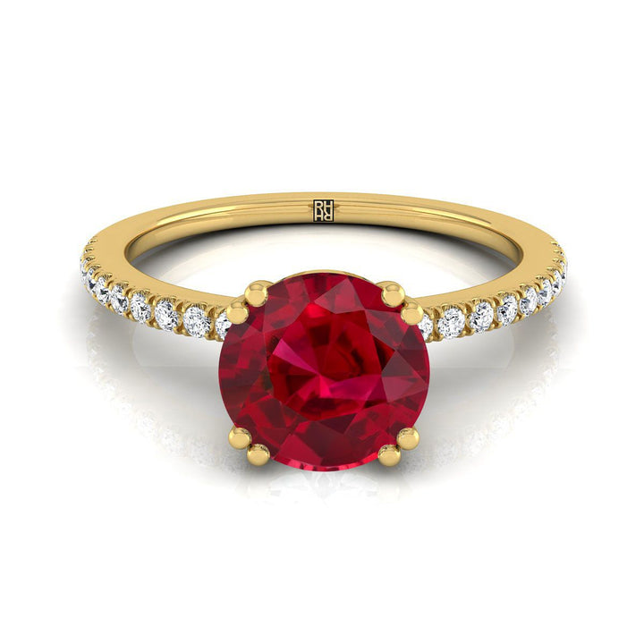 แหวนหมั้นเพชรแบบหนามคู่ฝรั่งเศสเรียบง่ายประดับทับทิมทรงกลมเจียระไนแบบ Brilliant สีทองเหลือง 14K - 1/6ctw