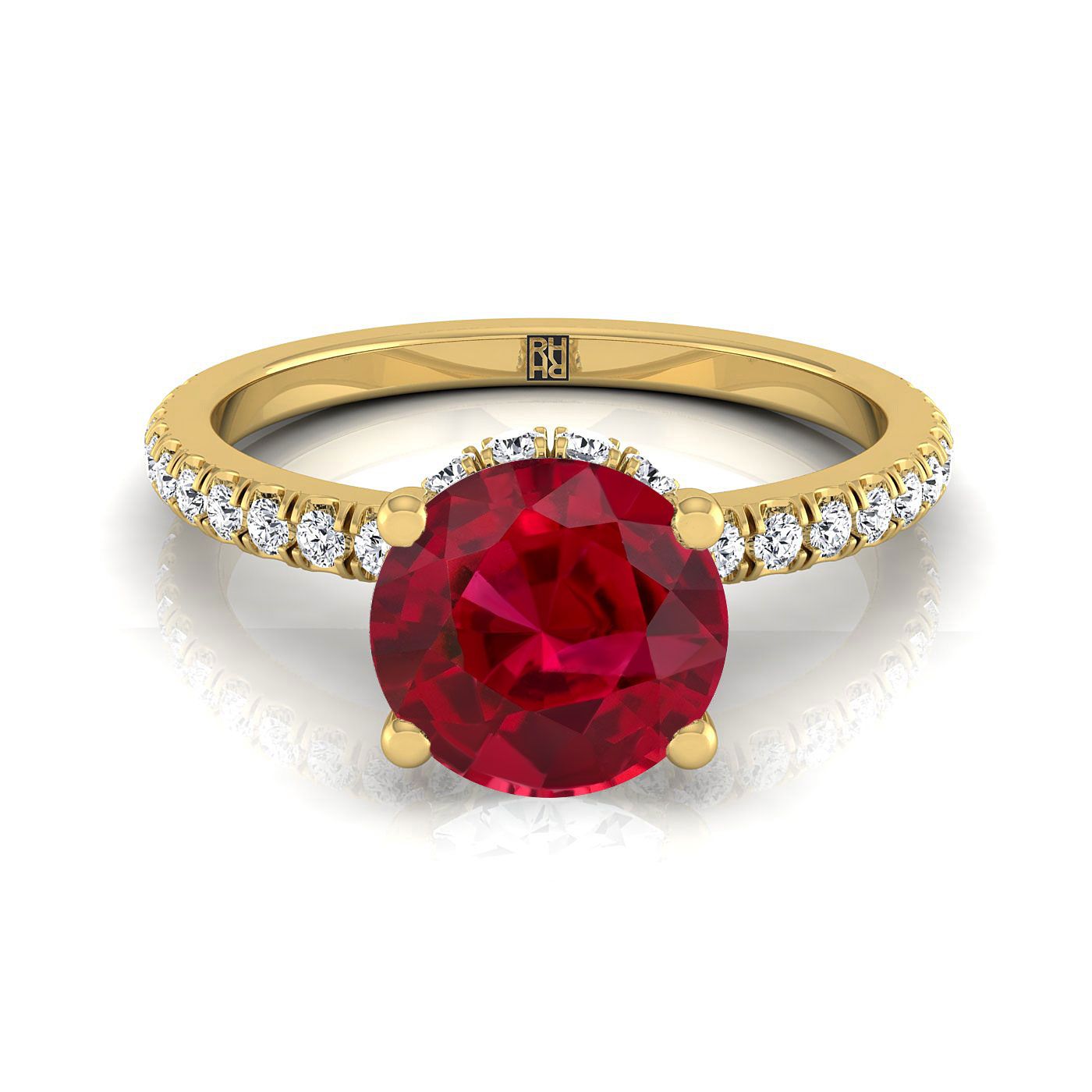 แหวนหมั้นเดี่ยวฝรั่งเศสประดับเพชรล้อมลับแบบวงกลมเจียระไนแบบบริลเลียนต์ด้วยทับทิม 18K ทองเหลือง -1/3ctw