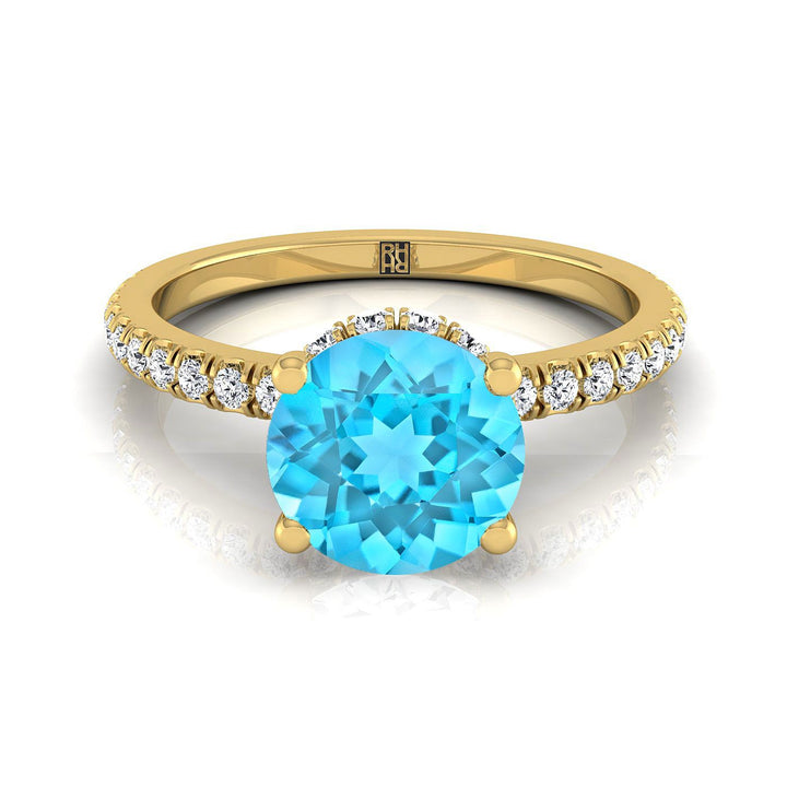 แหวนหมั้นเดี่ยวฝรั่งเศสประดับเพชรล้อมลับแบบวงกลมเจียระไนแบบบริลเลียนต์สีฟ้าสวิสโทแพซทองคำเหลือง 18K - 1/3ctw