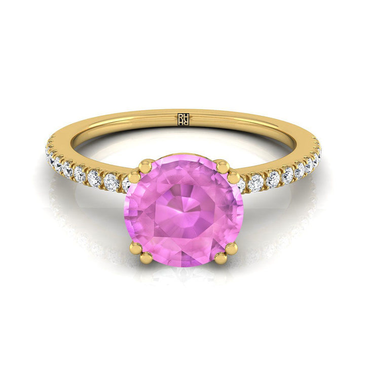 แหวนหมั้นเพชรหนามเตยคู่แบบฝรั่งเศสเรียบง่ายประดับแซฟไฟร์สีชมพูทรงกลมเจียระไนแบบ Brilliant ทองคำเหลือง 14K น้ำหนักเพชรรวม 1/6 กะรัต