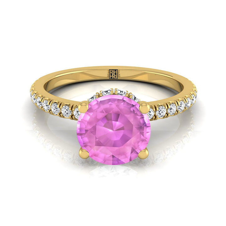 แหวนหมั้นเดี่ยวฝรั่งเศสประดับเพชรล้อมลับแบบพาเว่ ทองคำเหลือง 18K ทรงกลมเจียระไนแบบบริลเลียนท์ ประดับแซฟไฟร์สีชมพู -1/3ctw
