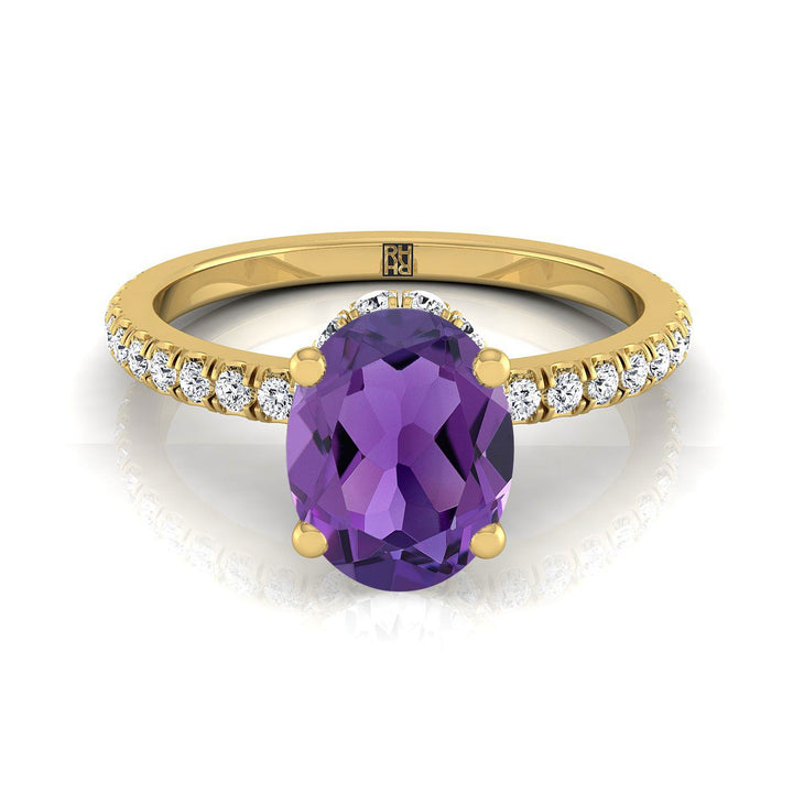 แหวนหมั้นเดี่ยวฝรั่งเศสประดับเพชรล้อมลับรูปไข่อเมทิสต์ทองคำเหลือง 18K - 1/3 กะรัตรวม