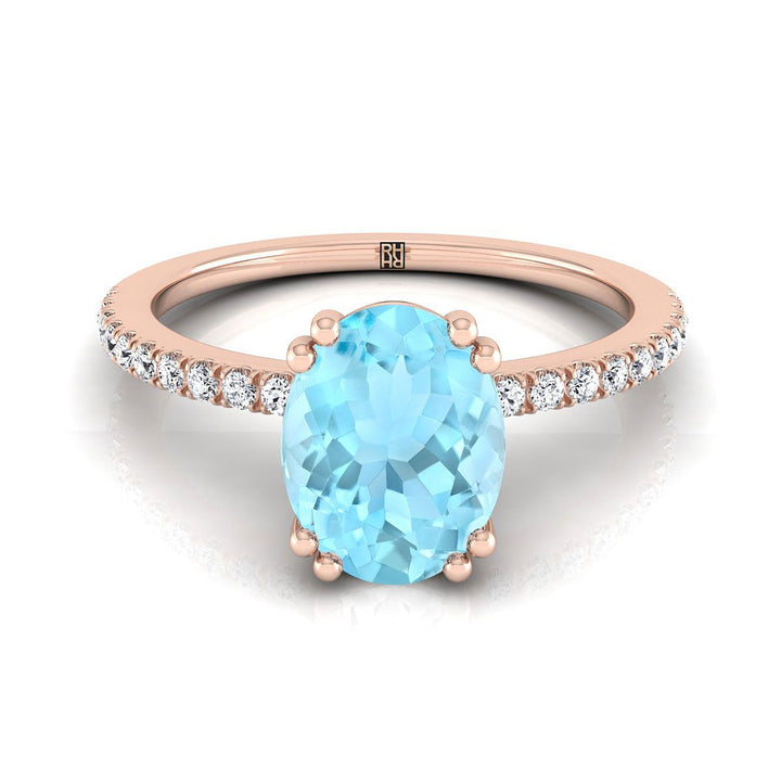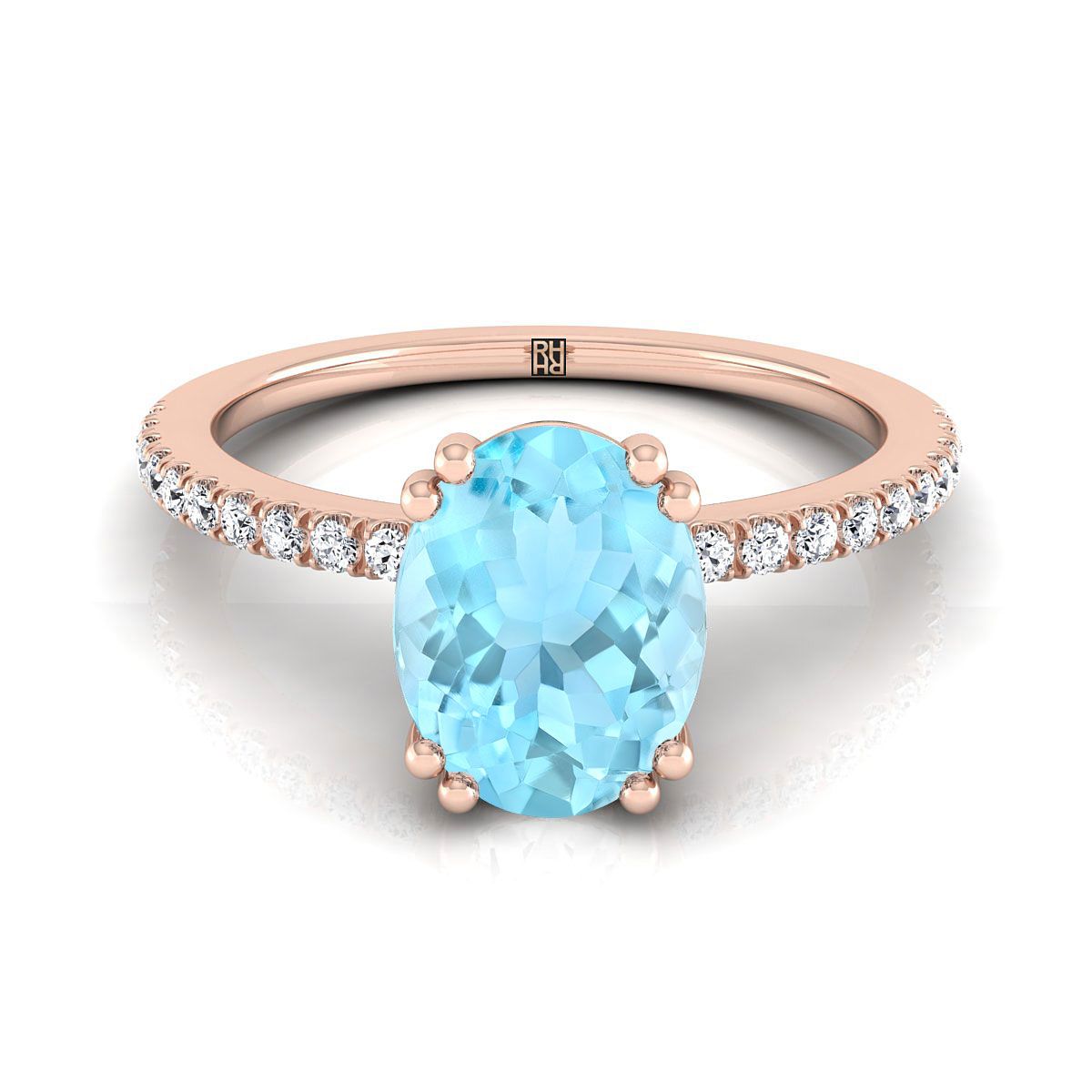 แหวนหมั้นเพชรแบบหนีบคู่ฝรั่งเศสเรียบง่ายรูปไข่อะความารีนทองกุหลาบ 14K