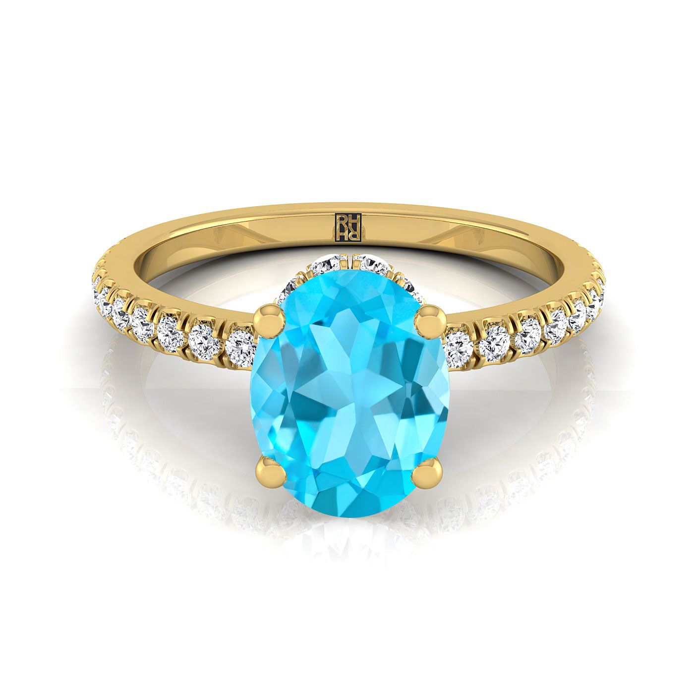 แหวนหมั้นเดี่ยวฝรั่งเศสประดับเพชรล้อมลับรูปวงรีสีฟ้าสวิส โทแพซทองคำเหลือง 14K -1/3ctw