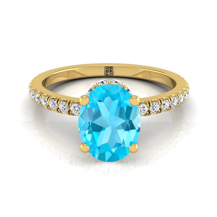 แหวนหมั้นทองคำเหลือง 18k พร้อมเพชรท็อปาซสีน้ำเงินรูปไข่ขนาด 8 x 6 มม. ตรงกลาง และเพชรกลมเจียระไนแบบ Brilliant จำนวน 36 เม็ด น้ำหนักรวม 0.31 กะรัต