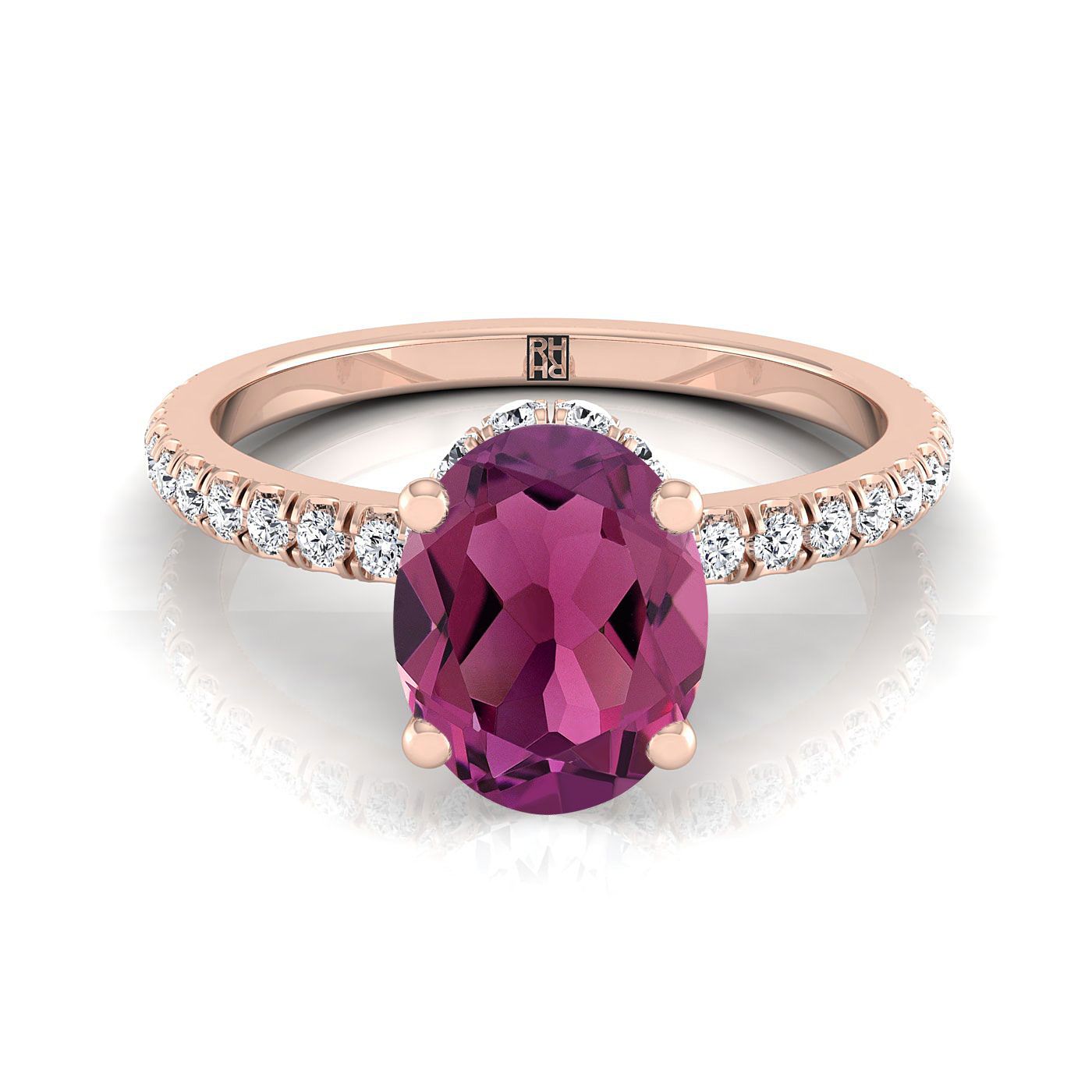 แหวนหมั้นเดี่ยวฝรั่งเศสประดับเพชรล้อมลับรูปไข่จากการ์เนตทองกุหลาบ 14K - 1/3 กะรัตรวม