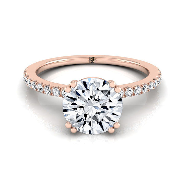 แหวนหมั้นเพชรทรงกลมเจียระไนแบบฝรั่งเศสเรียบง่าย ประดับด้วยก้านหนีบคู่แบบหนามคู่ ทองกุหลาบ 14K น้ำหนักเพชรรวม 1/6 กะรัต
