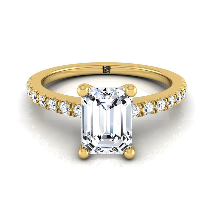 แสดงสไตล์อย่างสง่างาม แหวนหมั้นแบบเพชรตัดมรกตขนาดเล็กที่มีกรงแยกนี้แสดงให้เห็นเพชรเจียระไนแบบ Brilliant Cut (h-i/vs 0.20ctw) ที่ตั้งอย่างสวยงามในทองคำเหลือง 18 กะรัต