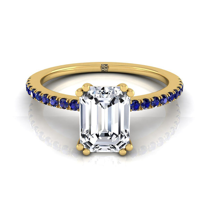 แหวนหมั้นแบบกึ่งติดตั้งเพชรทรงเอเมอรัลด์ที่แสดงถึงสไตล์อย่างสง่างามนี้ ประดับด้วยไพลินทรงกลม 22 เม็ดที่ตั้งด้วยกรงเล็บอย่างสวยงามในทองคำเหลือง 18 กะรัต