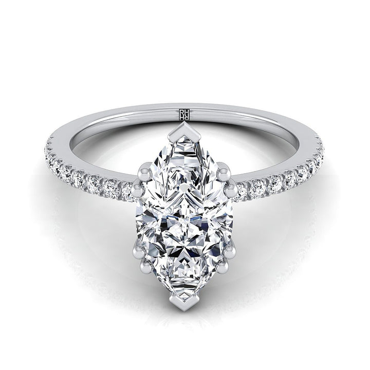 แสดงออกถึงสไตล์ที่สง่างาม แหวนตั้งครึ่งวงสำหรับหมั้นแบบมาร์คีสนี้นำเสนอเพชรเจียระไนแบบบริลเลียนต์ (h-i/vs 0.16ctw) ที่ตั้งด้วยหนามเตยอย่างสวยงามในทองคำขาว 14 กะรัต