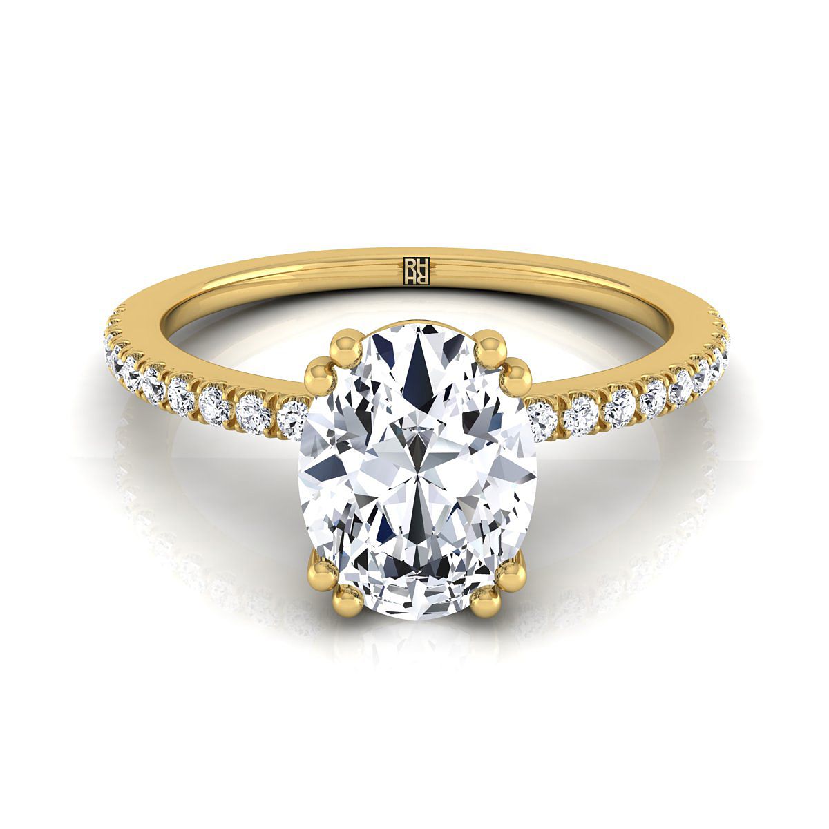 แหวนหมั้นทองคำเหลือง 14K รูปไข่ ประดับเพชรแบบฝรั่งเศสเรียบง่าย ฝังเพชรแบบปาเว่ กรงหนีบคู่