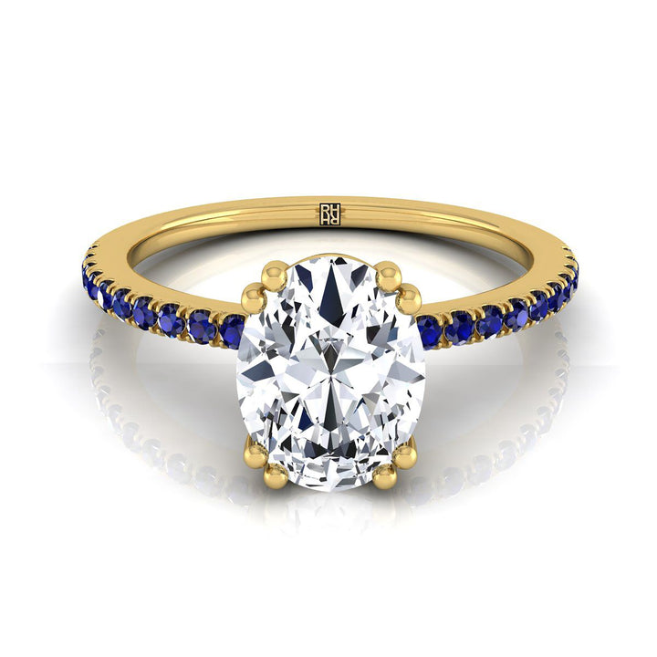 แสดงสไตล์อย่างสง่างาม แหวนตั้งครึ่งวงเพชรรูปไข่นี้นำเสนอแซฟไฟร์กลม 22 เม็ดที่ตั้งด้วยกรงเล็บอย่างสวยงามในทองคำเหลือง 18 กะรัต